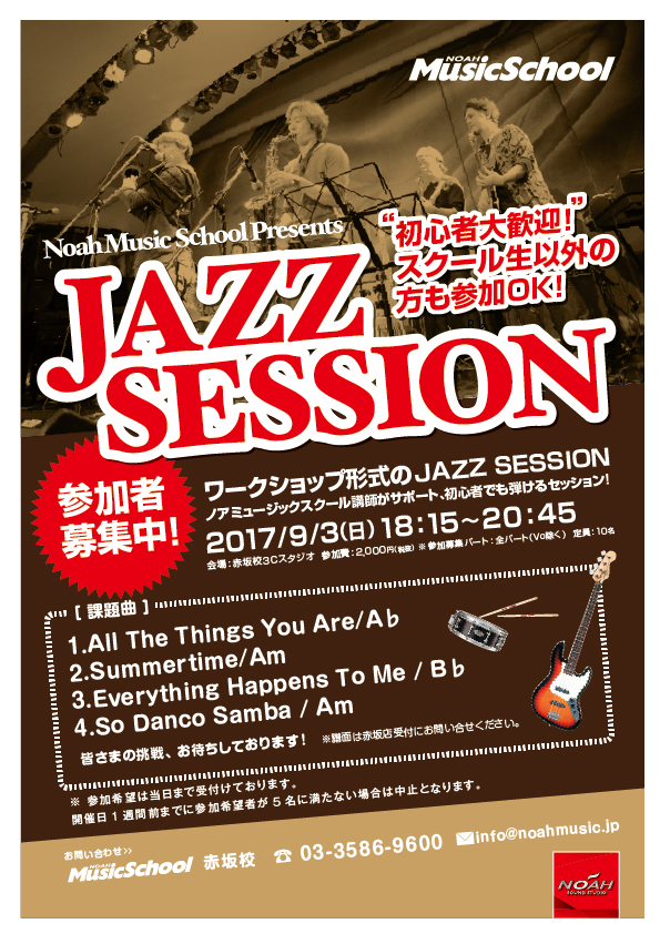 ワークショップ形式のJAZZ SESSIONノアミュージックスクール講師がサポート、初心者でも弾けるセッション!